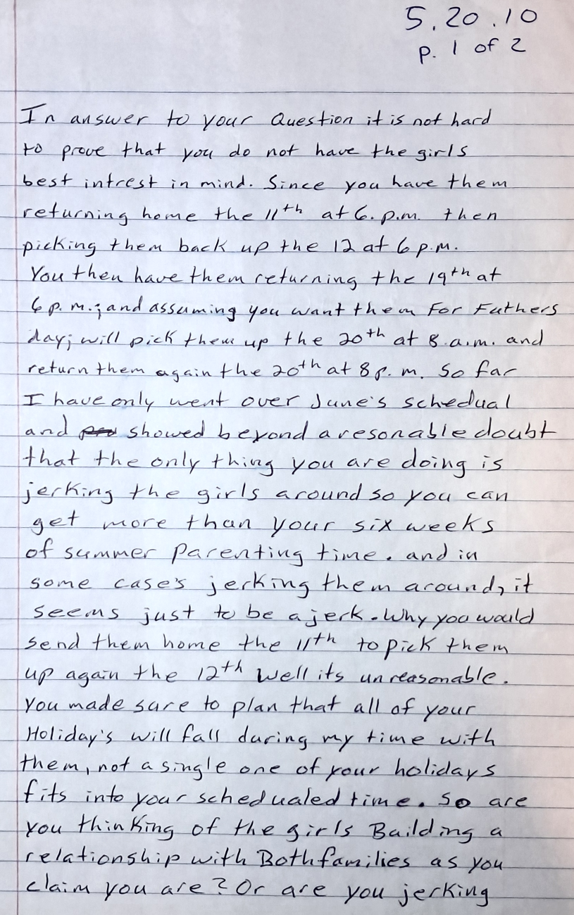 Evil Baby Mama then says, “You have them returning the 19th at 6pm, and assuming you want them for Father’s Day, will pick them up the 20th at 8am and return them again the 20th a 8am. So far I have only went over June’s schedule and showed beyond a reasonable doubt that the only thing you are doing is jerking the girls around so you can get more than your six weeks of summer parenting time”.