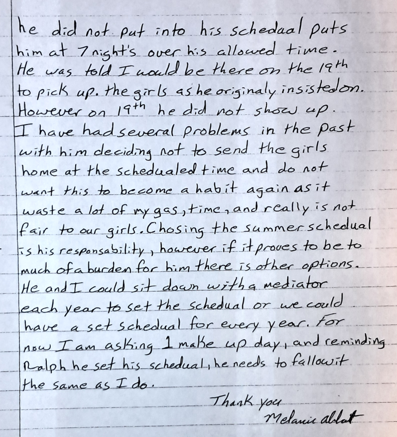 Per the court, the non-custodial parent (me) writes the Summer Schedule. Evil Baby Mama did not like that I had control of the Summer Schedule. Evil Baby Mama tried to change this multiple times and gain control of the Summer Schedule. That didn’t work for her.