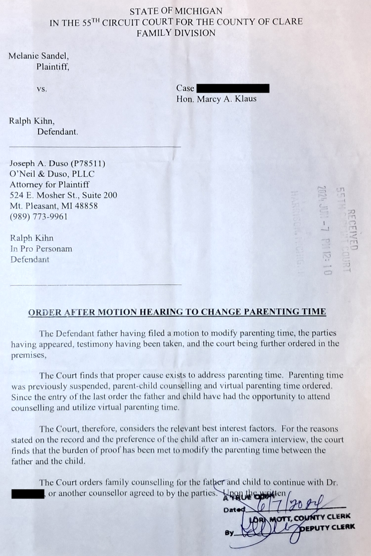 Order After Motion Hearing To Change Parenting Time – June 7, 2024
