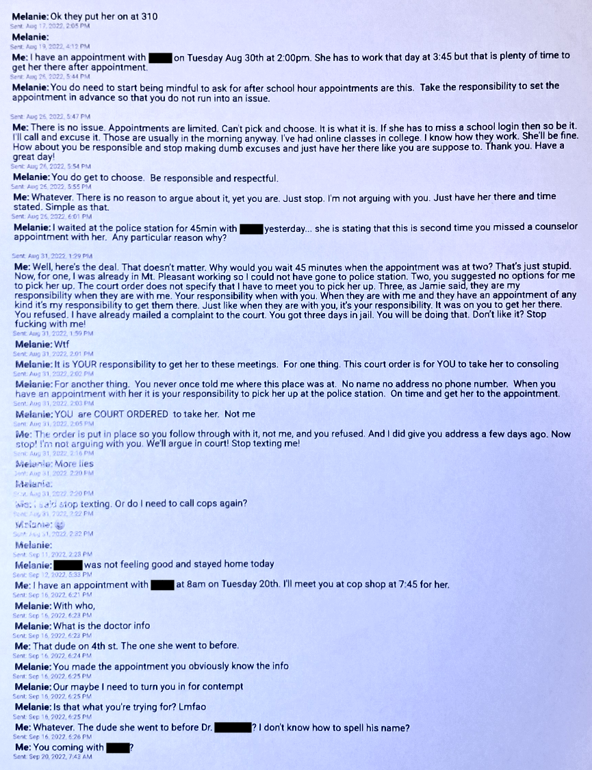 Evil Baby Mama is the one that took both of our girls into court to turn them against me. I tried to keep them out of court. I’m not lying. Evil Baby Mama is. Look at the text above with the date of July 20, 2022. Evil Baby Mama strait up tells me that I need to take my oldest daughter to court with me that day as she was with me and we had a hearing that day. I refused to take my daughter to court and I didn’t. Evil Baby Mama was taking our daughter into court to use against me but I’m the “selfish self righteous prick that would rather put his kids through court”. This dumb bitch is just fucking ignorant!