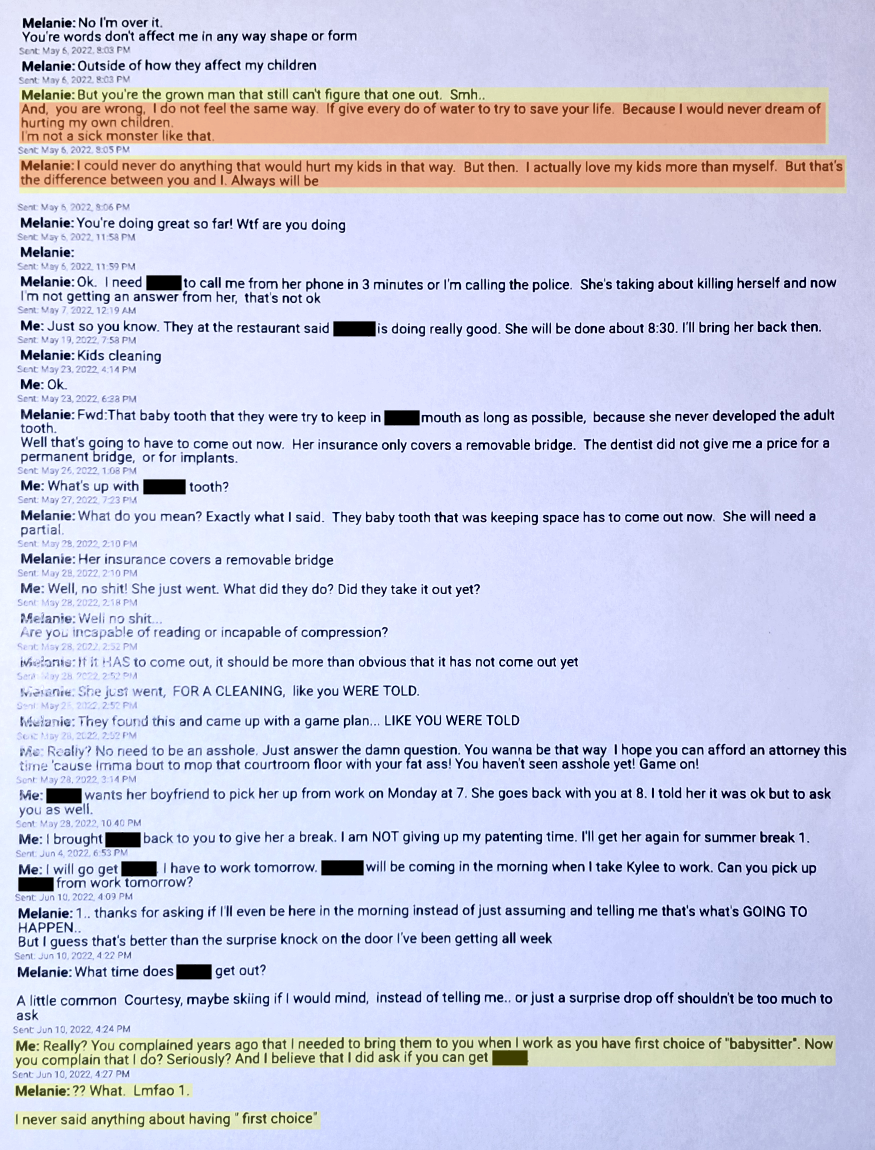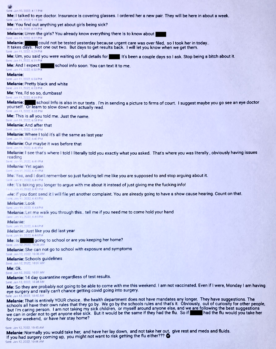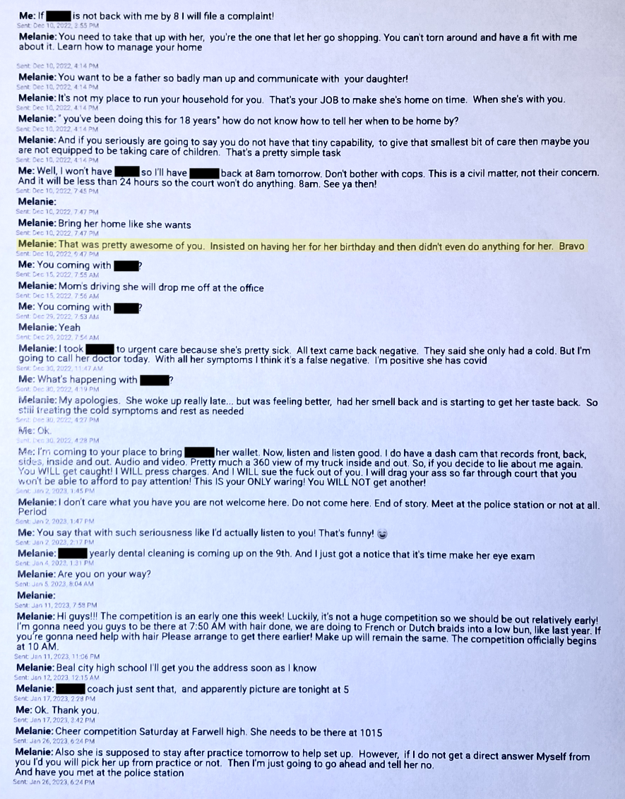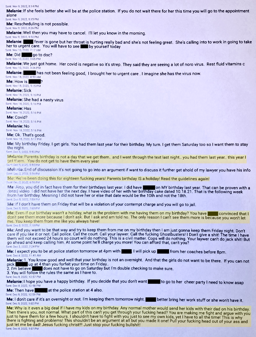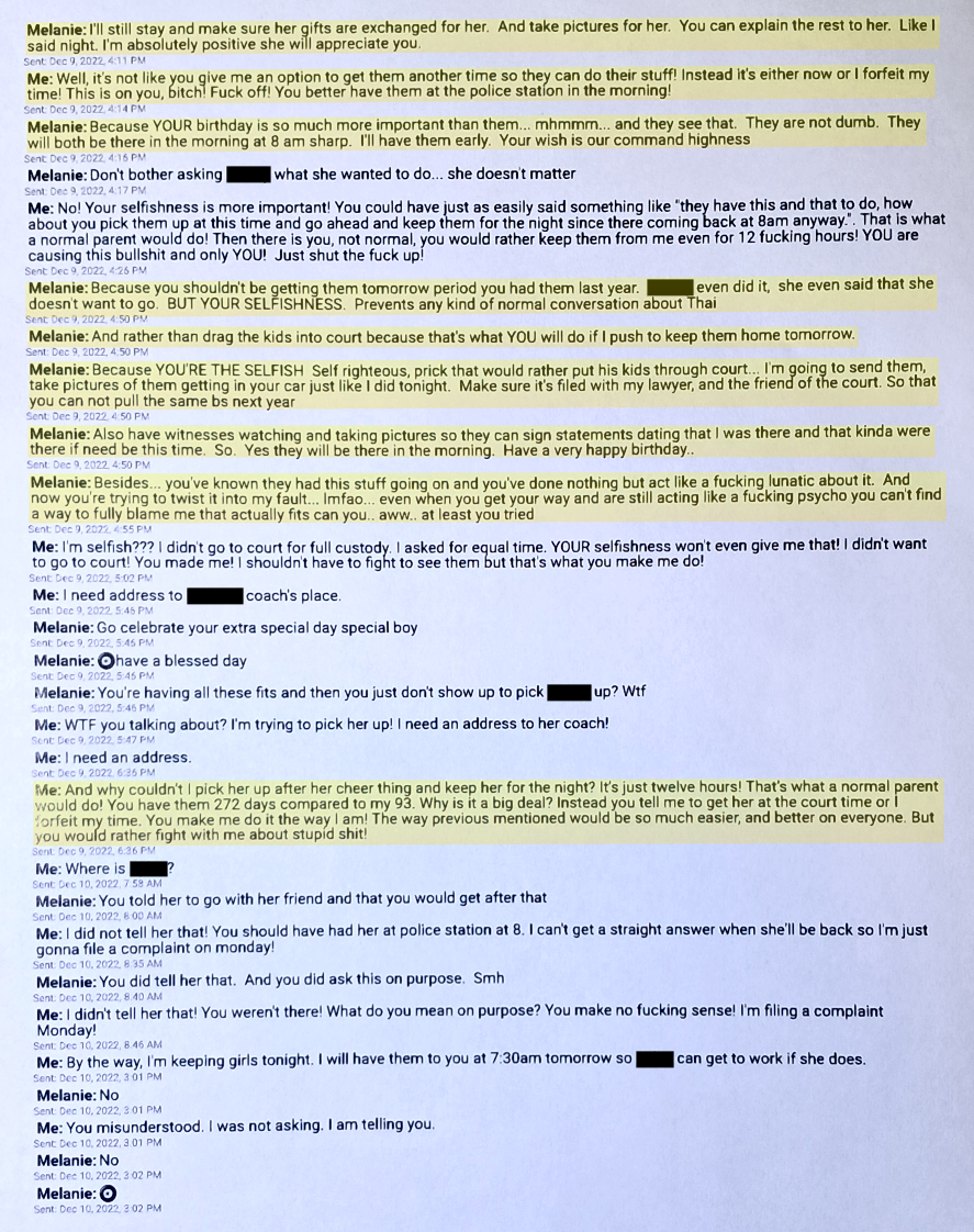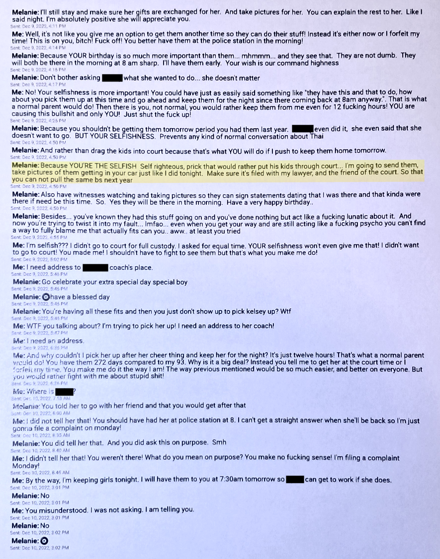Further down this page you will see a text from December 9, 2022. Evil Baby Mama is “verbally abusing” me and calling me a “Selfish self righteous prick that would rather put his kids through court”.