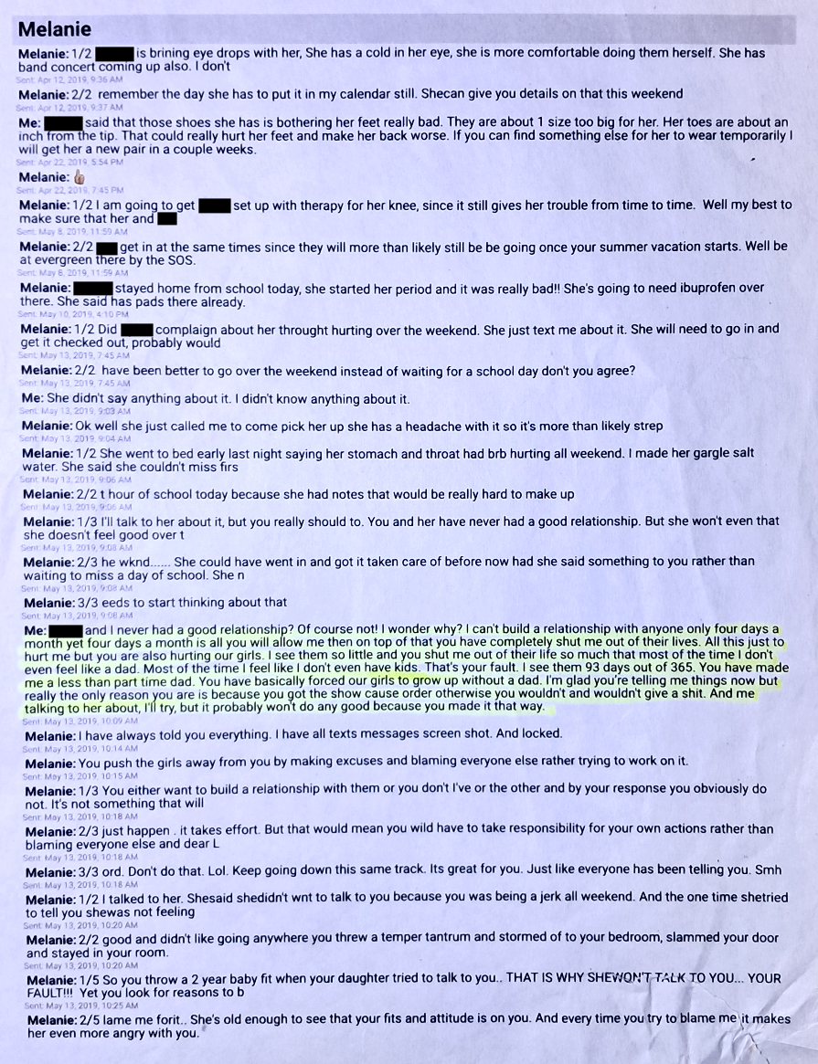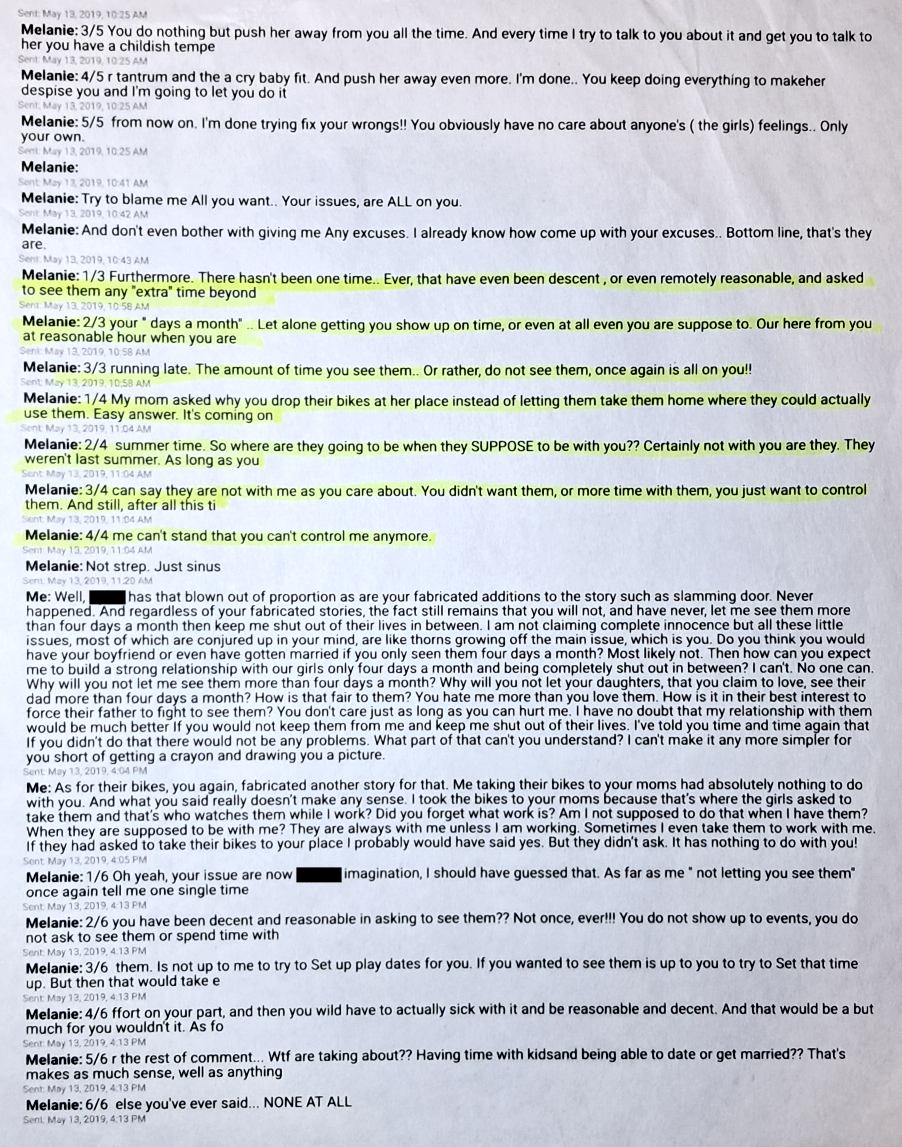 In this assortment, Text #1, I tell Evil Baby Mama that I don’t have a relationship with our oldest because I only see her 93 days a year. Of course, this can’t possibly be Evil Baby Mama’s fault. Instead I am just making excuses and blaming everyone else, according to Evil Baby Mama.
