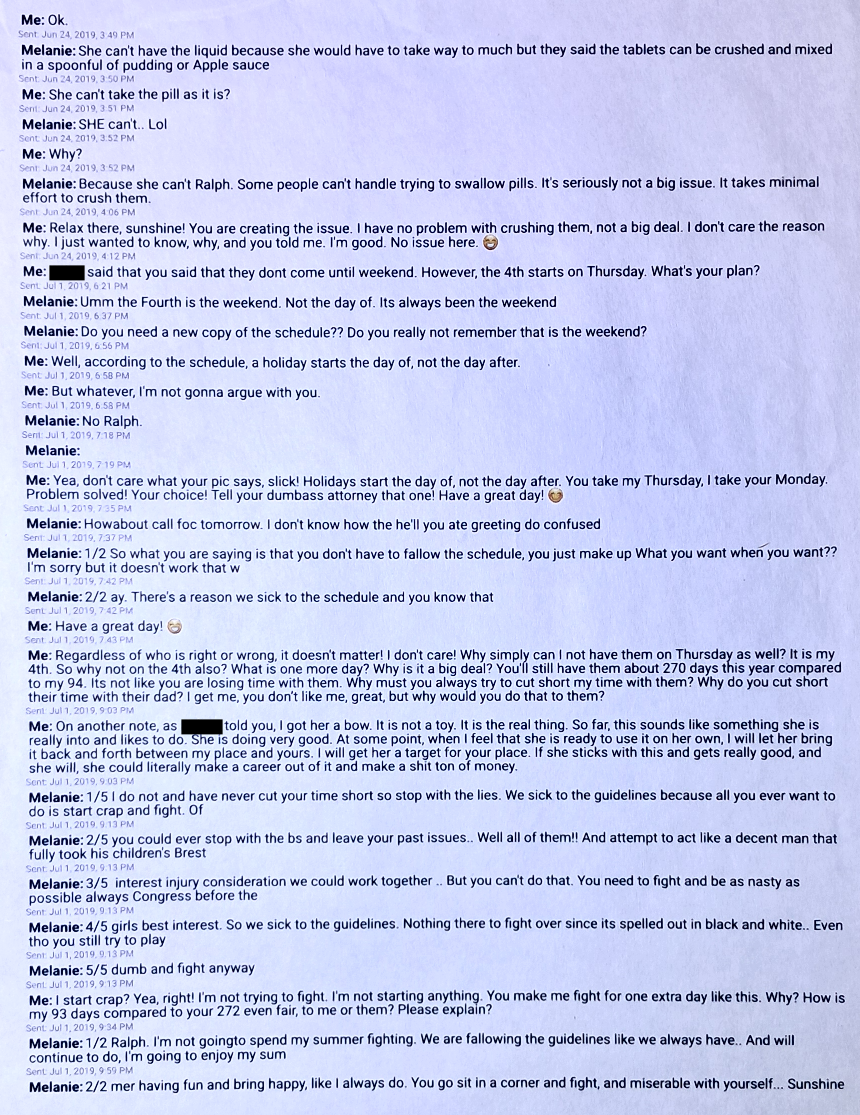 In Text #2, first Evil Baby Mama is a bitch because I ask a simple question about our daughter. Then an argument about the 4th of July. That holiday “weekend” was mine that year but the 4th was on a Thursday. And, Oh, my god! The heavens would fall and the and the Earth would stand still if I have my girls just one extra day!