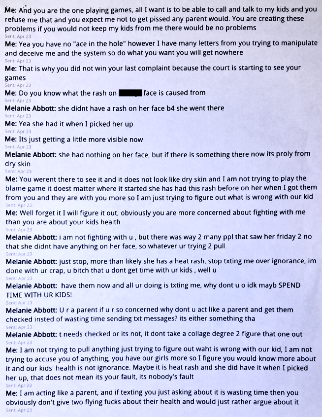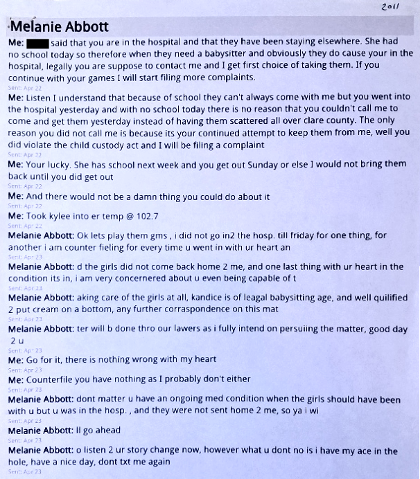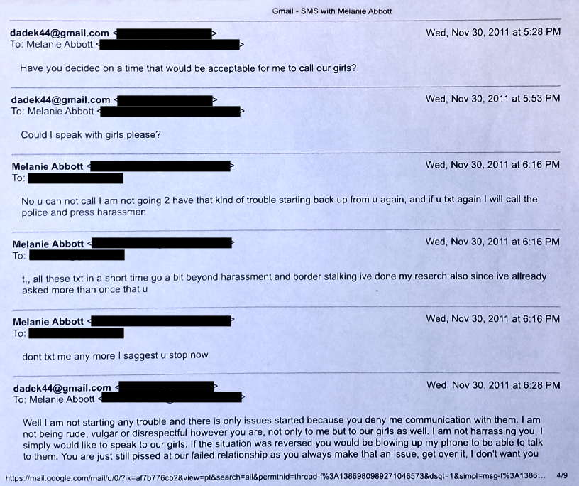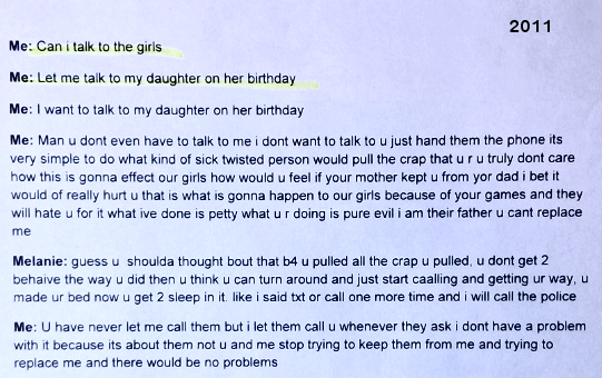 In Text #7, I was trying to get Evil Baby Mama to let me call and talk to my girls. Evil Baby Mama would not let me.