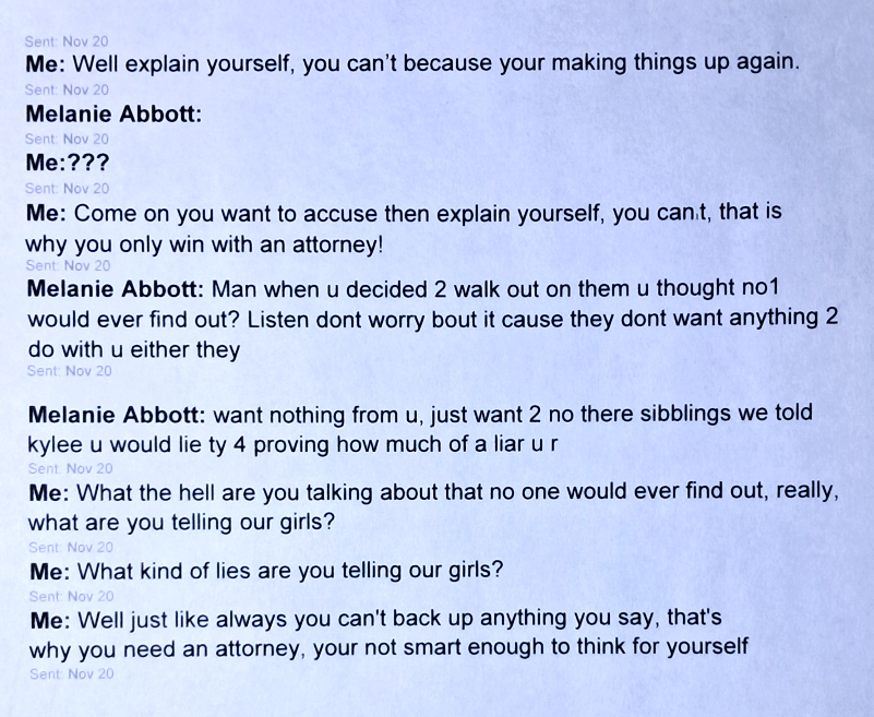 You weaponized my parenting time. You used it against me. You used it, our girls, to hurt me, to mentally and emotionally dismantle me, to destroy me. You were only able to do this because I love my girls so much. You’ve lied to people, family and friends. You’ve lied to the police. You’ve lied to the court, the judge. You’ve even lied to me, about me. But worst of all, you lied to our girls. I lost my girls, my babies, my world because of you and your lies. You brainwashed our girls and twisted your tales into colorful yarns painting yourself a “victim” while labeling me the bad guy. When, in reality, the bad guy is you! You continuously claimed that I was always up to something and out to get you. That has never been true, until now! This isn’t over! I am not done with you! Round 1 ended when our girls turned 18. You set the stage for Round 2 which begins NOW! All gloves are off! You did this! You deserve this! FAFO! I am coming for you! One day I will throw a lawsuit at you so fucking hard that it will knock you into the next fucking decade! I don’t care how old they get! I will fight for my girls until the day I take my last breath!