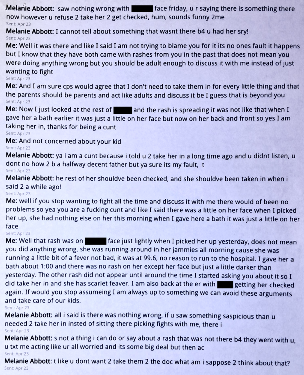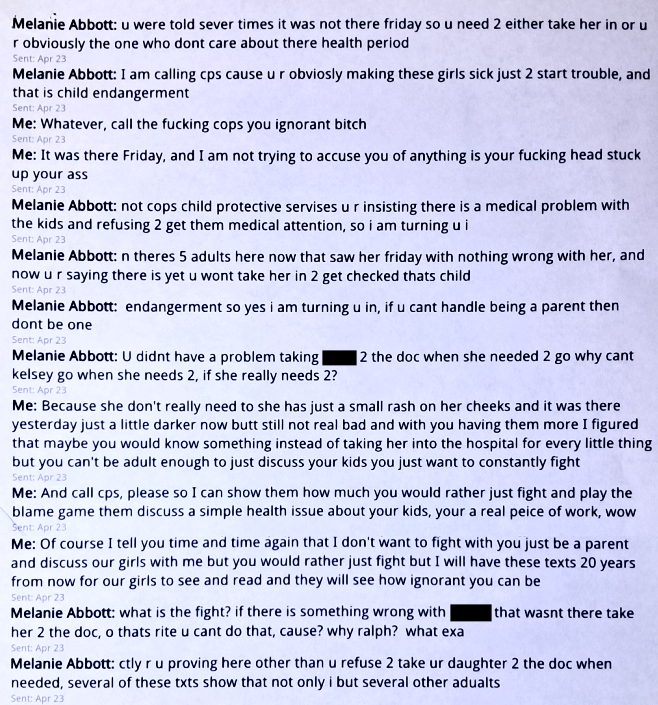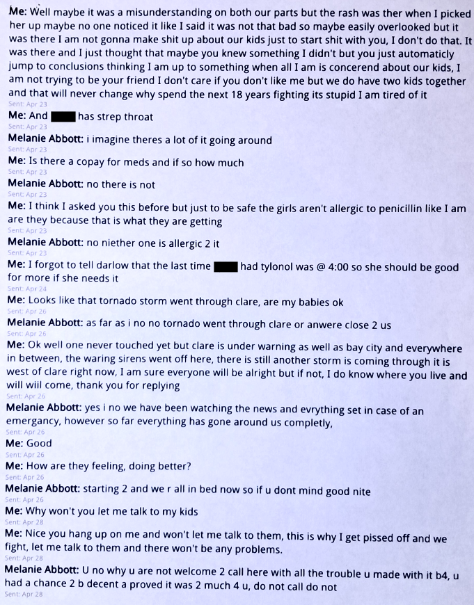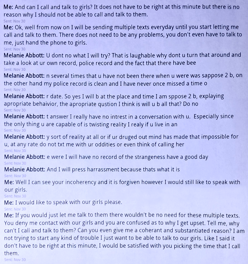 These texts are me trying to be able to talk to me girls and getting pissed because Evil Baby Mama won’t let me. Evil Baby Mama claims that I would cause problems if I called. That is not true. I just wanted to talk to my girls. I tried to explain this to Evil Baby Mama and tell her that there are problems because she won’t let me talk to our girls. Evil Baby Mama didn’t care. It was still my fault, no matter what.